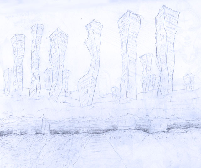 I had a wonderful Thanksgiving today. The Seussian City I sketched on the way to the farm, however, did not. It's kinda hard to draw a straight line in a truck bouncing on gravel roads.